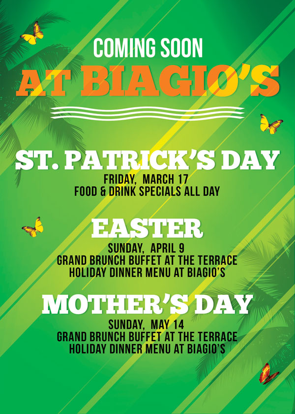 View EventsThinking of hosting an elegant event? We pride ourselves on personalized attention, and we look forward to working with you to customize a package that meets your specific needs. Whether you’re celebrating a Holiday Gala, Corporate Party, Christening, Wedding, Fundraiser, or High School Prom, we look forward to help you, and make your event a memorable one! Our Biagio's rooms can accomodate up to 150 people, for larger parties of up to 500 people, visit The Terrace.